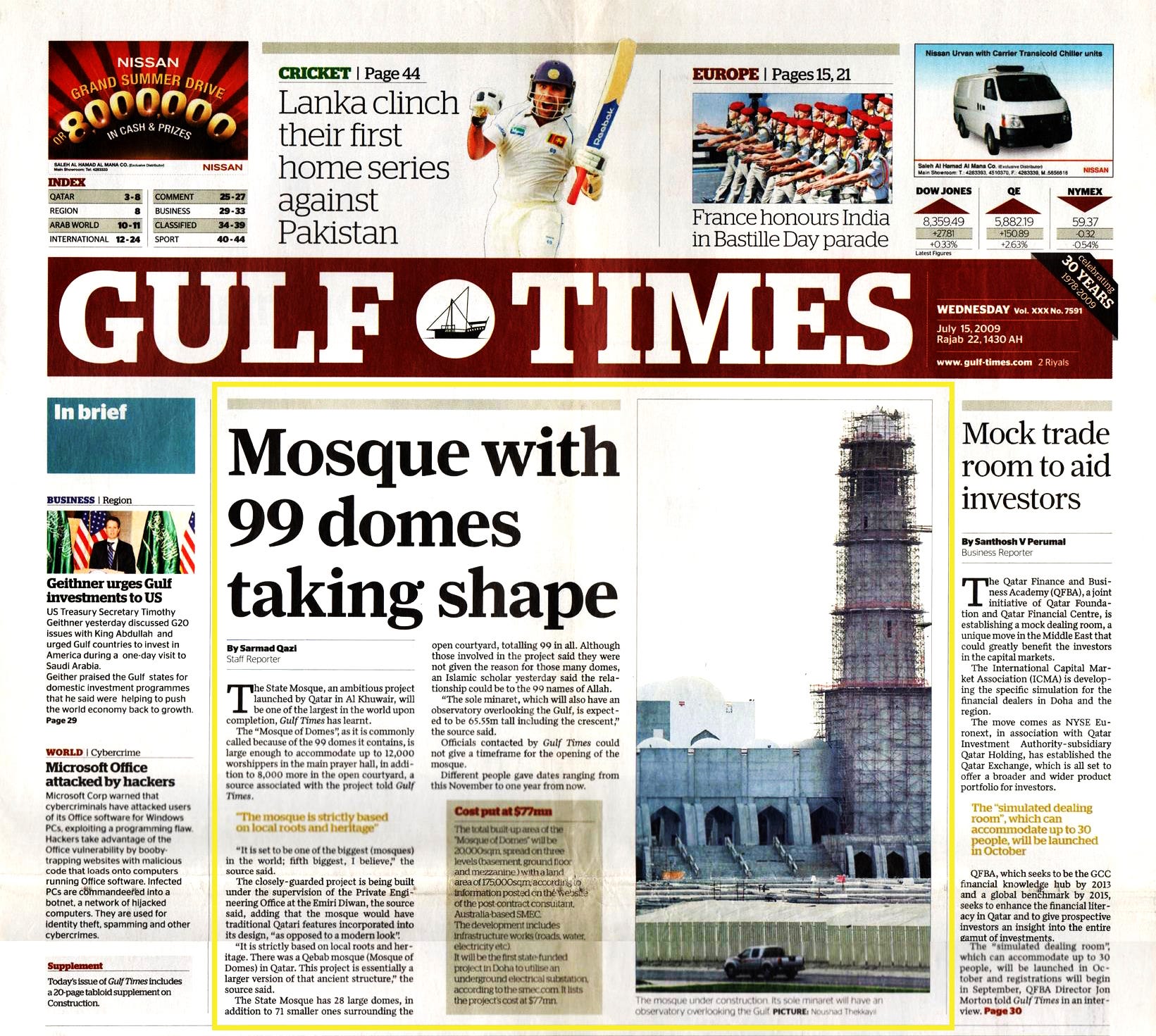 Original Gulf Times clipping: Mosque with 99 domes taking shape