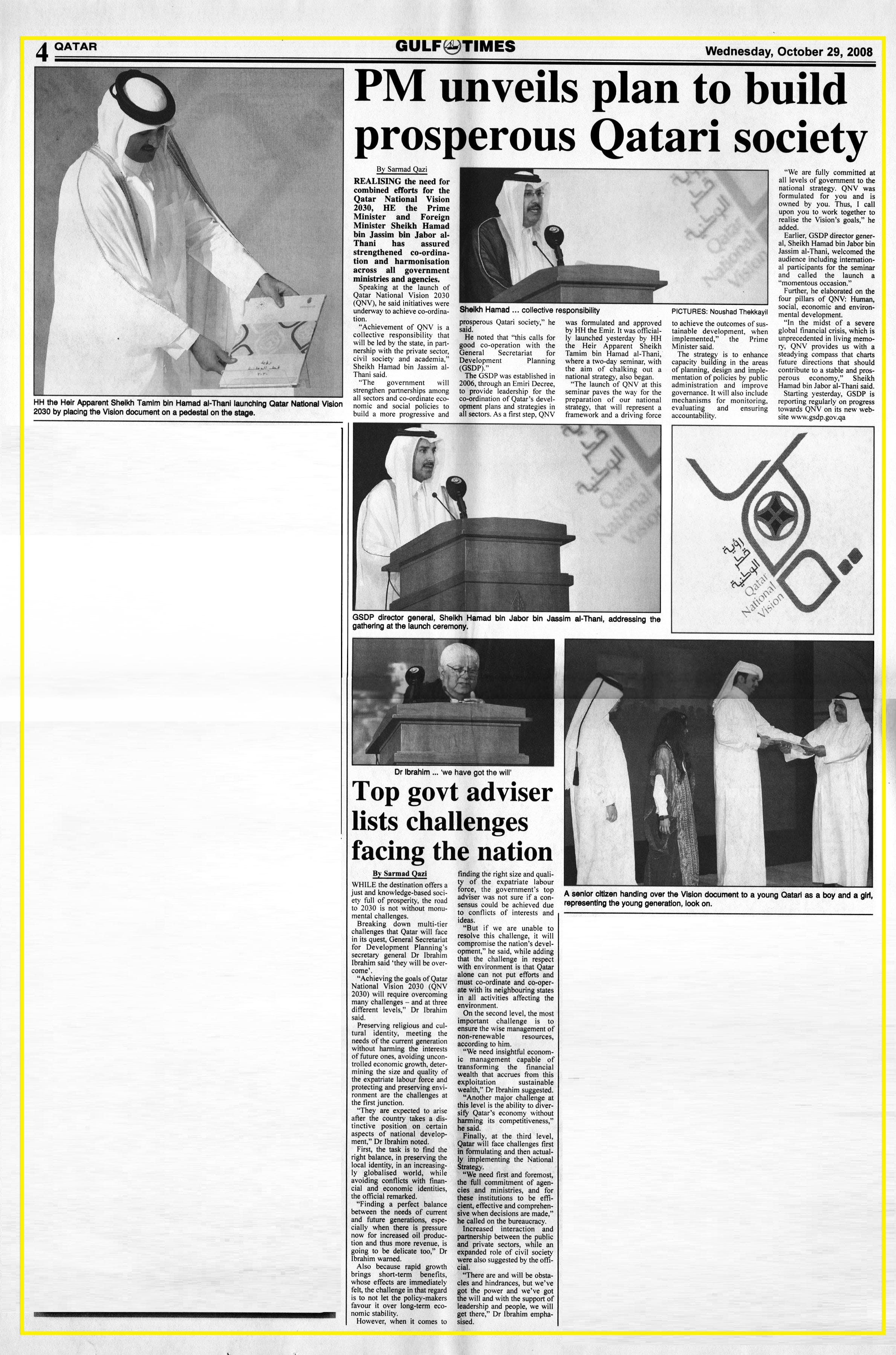 Original Gulf Times clipping: PM unveils plan to build prosperous Qatari society