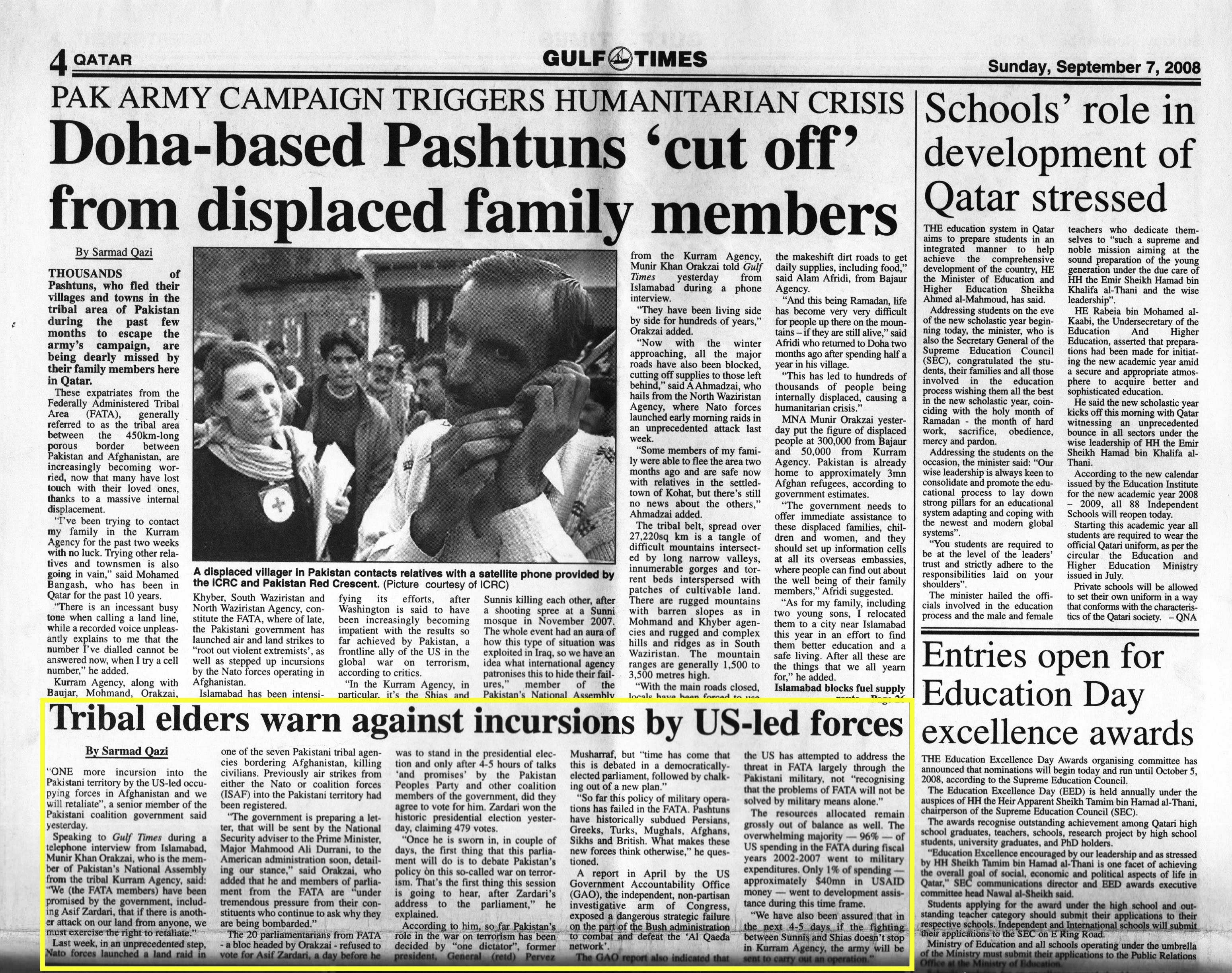 Original Gulf Times clipping: Tribal elders warn against incursions by US-led forces
