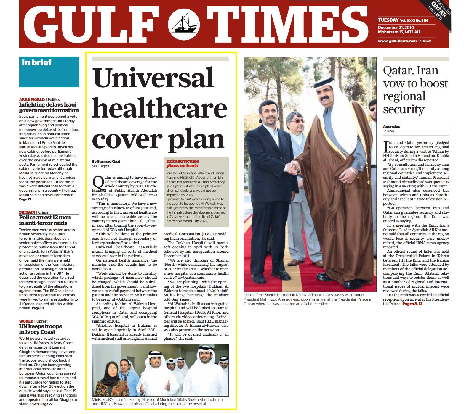 Qatar is aiming to have universal healthcare coverage for the whole country by 2012, HE the Minister of Public Health Abdullah bin Khalid al-Qahtani told Gulf Times yesterday.